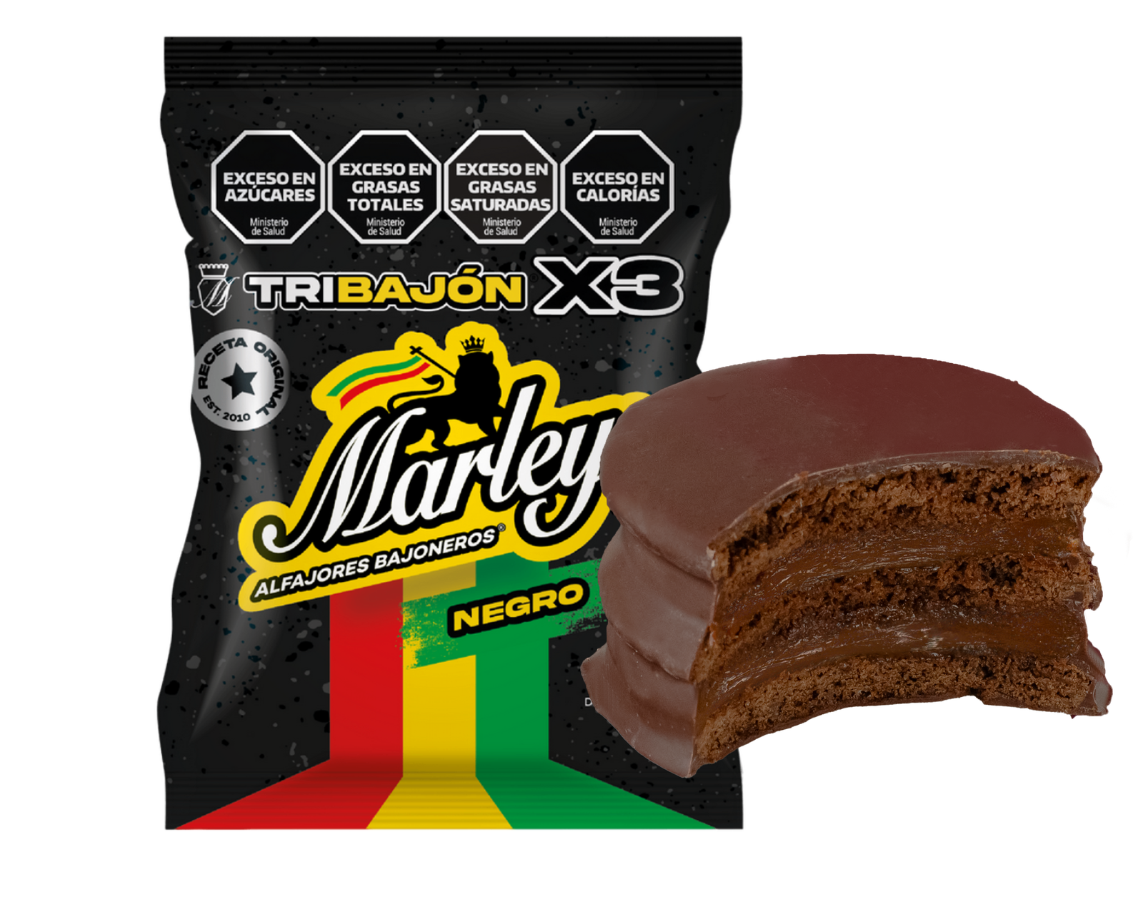 Nuevo TRI-BAJON®. Un producto que combina las deliciosas galletas Marley sin cobertura, con abundante dulce de leche y baño de chocolate, dando lugar a un alfajor blando, capaz de encantar a todos los paladares.
